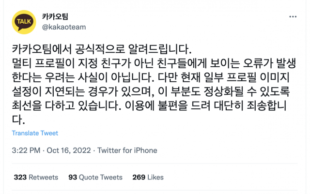 트위터 공식 계정을 통해서도 “멀티 프로필이 지정 친구가 아닌 친구들에게 보이는 오류가 발생한다는 우려는 사실이 아니다”라는 입장을 내놓았다. 다만 “일부 프로필 이미지 설정이 지연되는 경우는 있다”면서 “이 부분도 정상화될 수 있도록 최선을 다하고 있다”고 덧붙였다.