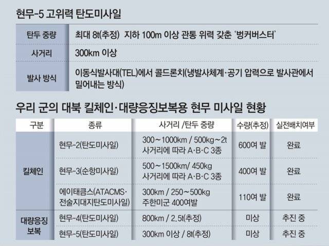 북한 지휘부가 한국을 겨냥해 전술핵을 장착한 미사일의 발사 단추를 누르는 순간 그에 버금가는 위력의 ‘벙커버스터’로 도발 원점을 초토화할 수 있는 우리 군의 보복 능력을 제대로 보여주는 방안을 고려하고 있다는 것이다. 최대 8t(추정)의 탄두를 장착하는 현무-5는 지하 100m보다 더 깊은 갱도의 지휘·전략 표적을 파괴할 수 있을 정도로 관통력이 뛰어나다. 현무-5는 북한의 탄도미사일보다 더 정확해 도발 원점에 대한 ‘족집게 초토화’가 가능한 것으로 평가된다.