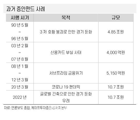 이번 증안 펀드는 과거처럼 대표 종목이나 상장지수펀드(ETF) 등 지수 상품을 매수하는 방식으로 시행될 가능성이 높다는 판단이다. 2000년 이후 증안펀드는 2003년, 2008년으로 각각 4000억원, 5150억원 규모로 시행된 바 있다. 당시에는 매달 1000억 원 규모의 증안펀드가 주식과 국공채에 투자하는 방식으로 시행됐다. 이어 2020년 3월에도 10조7000억원 규모의 자금이 조성되었으나, 증시가 반등하면서 시행되지 않았다.
