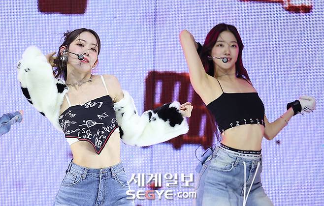 걸그룹 르세라핌 사쿠라(사진 왼쪽)와 카즈하가 17일 오후 서울 연세대학교 백주년기념관에서 진행된 두 번째 미니앨범 '안티프래자일(ANTIFRAGILE)'의 쇼케이스에 참석해 열띤 공연을 펼치고 있다.