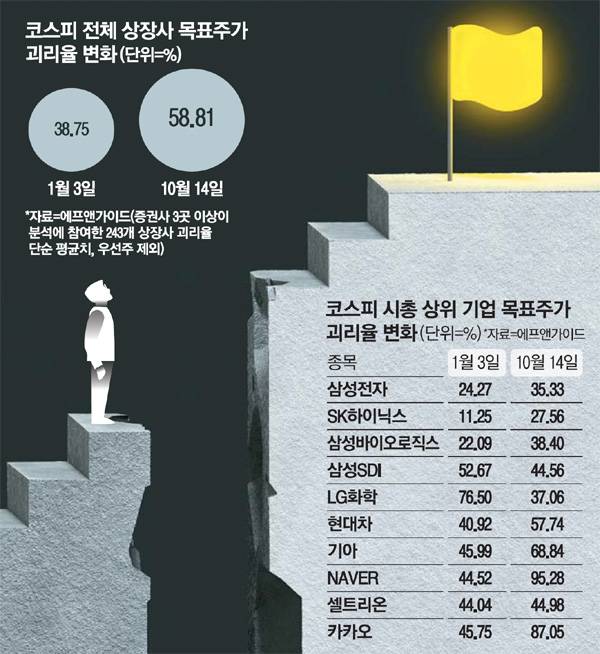 17일 금융정보업체 에프앤가이드에 따르면 증권사 3곳 이상이 분석한 243개 코스피 상장사들의 지난 14일 기준 평균 목표주가 괴리율(단순 평균으로 계산)은 58.81%로 집계됐다. 이는 연초 괴리율(38.75%) 대비 크게 증가한 수치다. 목표주가 괴리율은 증권사가 제시한 목표주가와 현재 주가의 차이를 백분율로 환산한 수치다. 괴리율이 크다는 것은 그만큼 목표주가가 실제 주가와 큰 차이가 있다는 뜻이다. 상승장에서는 목표치를 높게 잡는 경우도 있지만 올해와 같은 하락장에선 목표주가 조정이 제대로 이뤄지지 않으면서 괴리율이 커지는 것이 일반적인 패턴이다.