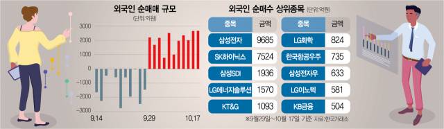 반도체와 2차전지 대형주들이 집중적으로 러브콜을 받았다. 특히 삼성전자(005930)(9678억 원), SK하이닉스(000660)(7523억 원), 삼성SDI(1935억 원), LG에너지솔루션(1570억 원) 등 반도체·2차전지 종목 중심으로 순매수를 이어갔다. 외국인은 HPSP(403870)(136억 원), 리노공업(058470)(41억 원) 등 코스닥 반도체 업체들도 순매수했다. 앞서 9월 한 달 동안 삼성전자와 SK하이닉스를 각각 1조 8575억 원, 2268억 원 씩 팔아 치운 것과 대조된다.