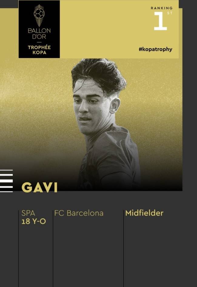 올 시즌 영광은 가비에게 돌아갔다. 가비는 에두아르 카마빙가(레알 마드리드), 주드 벨링엄(도르트문트), 누노 멘데스(파리 생제르맹), 자말 무시알라(바이에른 뮌헨) 등 쟁쟁한 후보를 제치고 코파 트로리를 거머쥐었다.