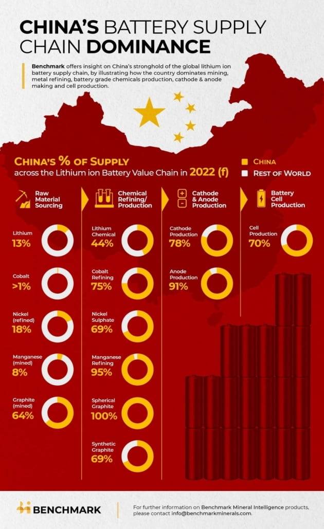 배터리 소재를 중국에 의존하는 것은 에코프로비엠만의 문제는 아니다. 시장조사업체 벤치마크인텔리전스에 따르면 중국은 제련 시장에서 리튬 44%, 코발트 75%, 니켈 69%, 망간 95%를 차지하고 있다. 음극재에 쓰이는 흑연 공급비중은 채굴 시장에선 64%이며 제련 시장에선 천연흑연 100%, 인조흑연 69%에 달한다.