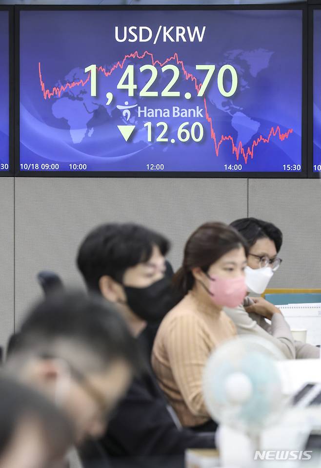 [서울=뉴시스] 김근수 기자 = 원·달러 환율이 전 거래일(1435.3원)보다 12.6원 떨어진 1422.7원에 마감한 18일 오후 하나은행 딜링룸 전광판에 환율이 표시되고 있다. 코스피는 전 거래일(2219.71)보다 30.24포인트(1.36%) 상승한 2249.95에 장을 마감했다. 코스닥지수는 전 거래일(682.00)보다 15.09포인트(2.21%) 오른 697.09에 거래를 종료했다. 2022.10.18. ks@newsis.com