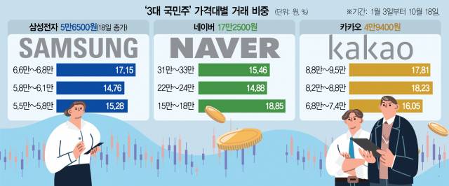 18일 서울경제는 올해 1월부터 이날까지 삼성전자와 네이버·카카오 등 이른바 ‘국민주’로 꼽히는 세 곳의 기업을 골라 가격대별 매물 집중도를 분석해 이 같은 결과를 얻었다. 이들은 개인투자자들이 올 들어서만 각각 17조 5317억 원, 3조 1022억 원, 2조 1434억 원어치를 사들인 코스피 순매수 ‘톱3’ 종목이다.