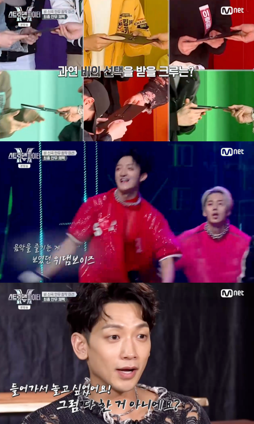 최종적으로 비의 선택은 위댐보이즈였다. 위댐보이즈는 비의 신곡에 안무 디텍터로 참여하게 됐으며, 가산점을 획득했다. 나머지 크루는 댄서로 함께 참여하게 됐다. 비는 “저는 대중가수잖아요. 위댐보이즈를 빼고 잘 보시면 웃는 사람이 거의 없다. 이 노래에 웃고 즐긴다. 같이 가서 놀고 싶었어요. 그럼 다 한거 아니냐”고 극찬하며 선택의 이유를 밝혔다. /cykim@osen.co.kr