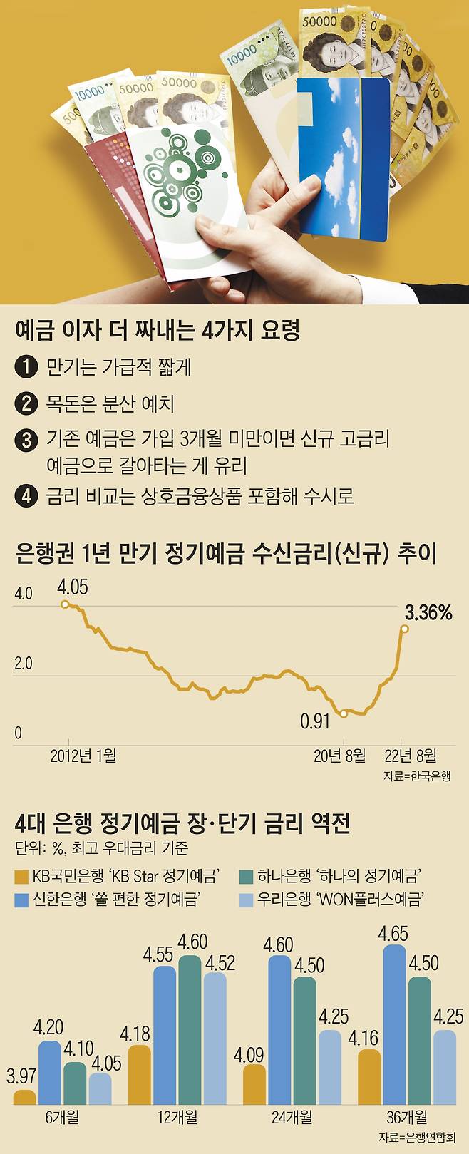 요즘 자고 일어나면 은행들이 예·적금 금리를 올렸다는 소식이 들린다. 지난 12일 한국은행이 지난 7월에 이어 역대 두 번째 ‘빅 스텝(기준금리 0.5%포인트 인상)’을 밟으면서 은행권이 예·적금 금리를 올리는 속도도 빨라지고 있다. KB국민·신한·하나·우리은행 등 4대 은행 1년 정기 예금 금리가 모두 연 4%대 중반으로 올라섰다. 2011년 7월 이후 11년 만에 은행권 4%대 정기 예금 금리 시대가 부활한 것이다. 일부 저축은행은 연 5%대 예금도 선보이고 있다.