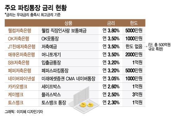 19일 금융권에 따르면 현재 가장 높은 수준의 파킹통장 금리를 주는 곳은 웰컴저축은행이다. 웰컴저축은행은 이날부터 '웰뱅 직장인사랑 보통예금' 금리를 0.3%P(포인트) 인상해 연 최고 3.8% 금리를 제공 중이다.