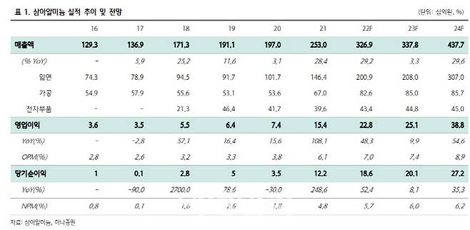 삼아알미늄, 2차전지 양극박 사업 성장..수익성 개선 기대-하나