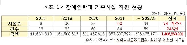 최 의원은 "장애인 학대시설에 성금을 지원하는 것은 공적 책임과 투명성을 믿고 후원한 국민의 신뢰를 저버리는 행위"라며 "지원을 결정하기 전 장애인 인권침해 처분 대상 여부를 확인하도록 관련 제도를 정비해야 한다"고 강조했다.
