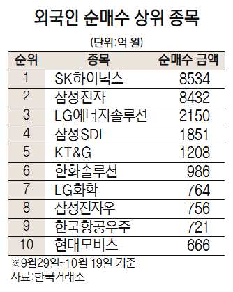 최근 외국인들의 매수세는 SK하이닉스(000660)(8534억 원)와 삼성전자(005930)(8434억 원) 등 반도체 대장주에 집중되고 있다. 특히 외인들은 SK하이닉스를 14거래일 연속 순매수했다.