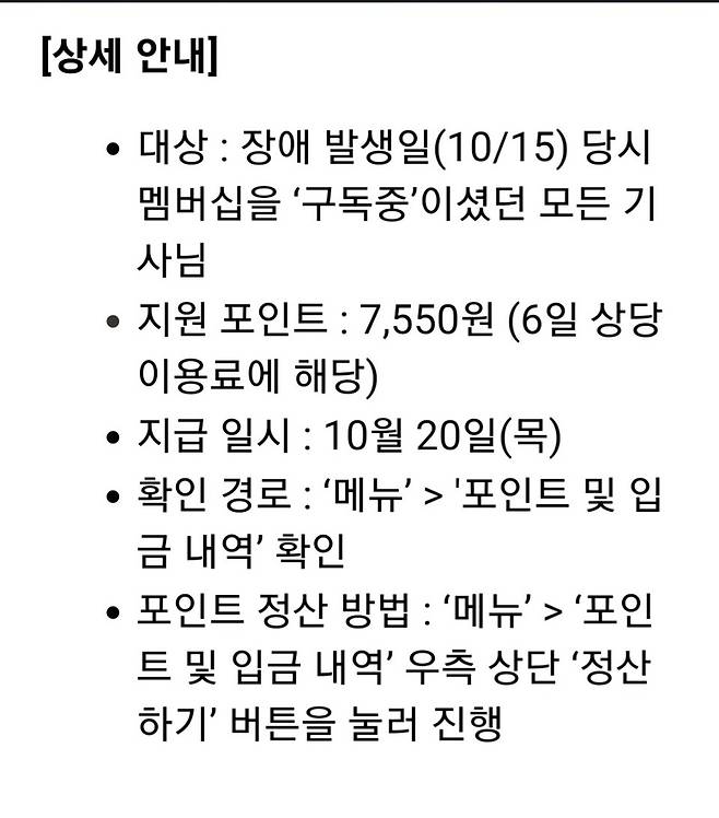 해당 포인트는 6일 상당의 멤버십 이용료에 해당되는 수준으로, 멤버십 가입 기사들에 한해 내일(20일) 지급될 예정입니다.