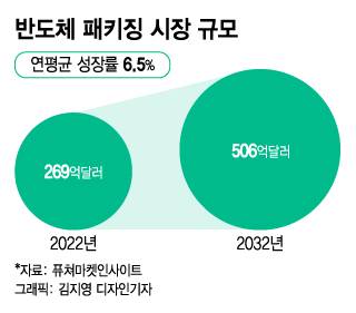 19일 반도체업계에 따르면 반도체 초미세화 경쟁이 심화되면서 후공정 중요도는 계속해서 올라가고 있다. 글로벌 시장조사기관 퓨처마켓인사이트에 따르면 전세계 반도체 패키징 시장 규모는 올해 269억달러(약 38조4000억원)로 전망된다. 연평균 6.5% 성장률을 보이며 10년 후인 2032년엔 506억달러(약 72조2315억원)에 이를 것이란 예측이다.