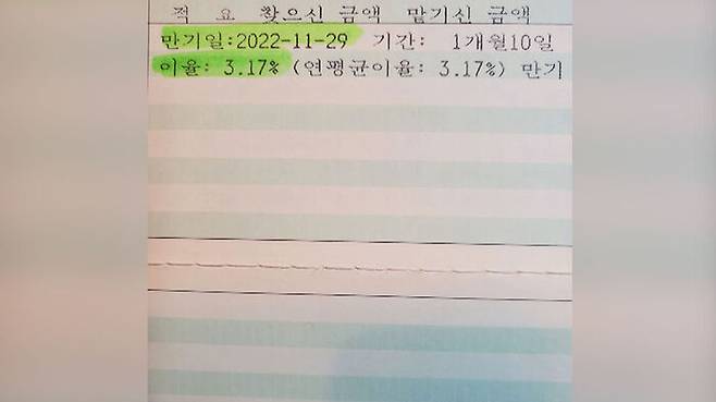 그래서 수신금리 오르는 거 맞춰서 일부러 만기 날짜를 그렇게 잡았는데요, 예금 재예치하면서 만기날을 1개월 10일 뒤인 다음 달 29일로 잡았습니다.