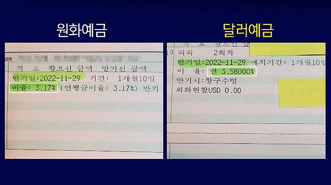 [은행직원 : (외화) 정기예금은 1개월에 3.58%, 원화는 1개월이 더 낮죠. (기간을 1년으로 하면요?) 원화는 1년에 4.5%고요, 외화는 1년이 5.2%입니다. (훨씬 높네요.)]