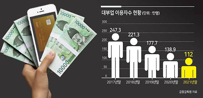 실제 대부업 이용은 점차 줄어들고 있다. 금감원에 따르면 2021년 말 대부업 이용자 수는 112만명으로 법정최고금리가 27.5%였던 3년 전(247만명)에 비해 절반 가까이 줄었다. 여기에 최고금리가 24%에서 20%로 내려간 지난해 7월 이후에는 이용자가 약 11만명 감소했다.