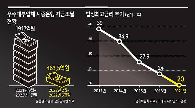 ▶1917억→463.5억 시중은행 자금조달 급감= 국회 정무위원회 소속 윤창현 국민의힘 의원이 금융감독원에서 받은 국정감사 자료에 따르면 지난해 9월부터 올해 6월 말까지 약 10개월 간 우수대부업체가 시중은행으로부터 조달한 자금은 2380억5000만원이었다.
