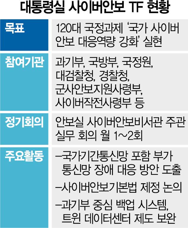◇개인정보보다 안보···법제화 탄력=카카오 사태를 국민들이 체감하면서 TF에서 논의되는 법안과 정책들이 속도감 있게 추진될 수 있다는 정부의 자신감도 전제돼 있다. 개인정보 등의 이유로 16년째 국회 문턱을 넘지 못하고 있는 사이버 안보기본법 논의도 탄력이 붙을 것으로 전망된다. 사이버안보기본법은 2006년 이후 현재까지 유사 법안 11건이 발의됐다. 21대 국회에도 조태용 국민의힘 의원이 발의한 사이버안보기본법안, 김병기 더불어민주당 의원이 발의한 국가사이버안보법안, 윤영찬 민주당 의원이 발의한 사이버보안기본법안 등이 계류 중이다. 개인정보를 비롯한 민간인 사찰 등을 이유로 반대 여론에 번번이 부딪혀 좌초됐다.