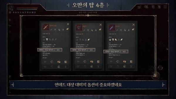 최근 오만의 탑 4층이 열렸다. 오만의 탑 4층은 죽음 속에서 되살아난 보스 몬스터 죽음의 좀비 로드와 안식을 얻지 못한 언데드 몬스터가 출몰하는 지역이다. 보스 몬스터인 죽음의 좀비 로드는 언데드 타입의 땅 속성 몬스터로 토벌에 성공하면 '죽은 자의 망토', '분노의 목걸이', '격분의 장갑' 등 다양한 전리품을 획득할 수 있다. 오만의 탑 4층은 언데드 타입 몬스터가 등장하는 특성 때문에 '언데드 대상 대미지 옵션'이 유용하다.