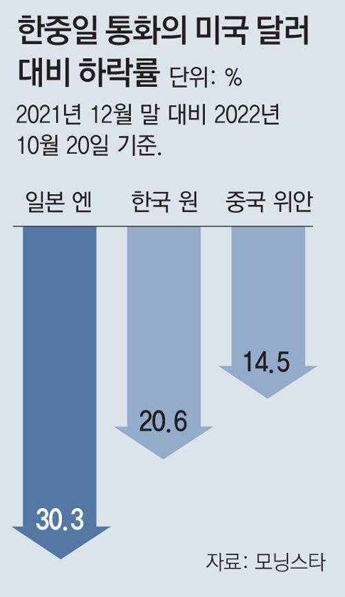 日 엔화 가치 32년만에 최저 中 위안화도 역대 최저 수준 韓 무역적자 확대 등 타격 우려