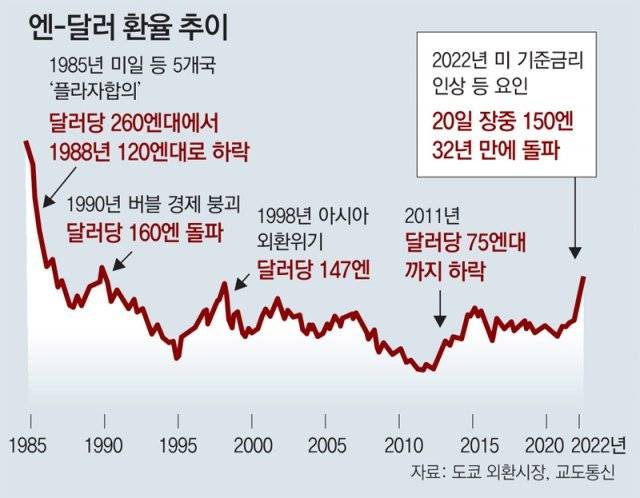 20일 도쿄 외환시장에서 엔화 환율은 장중 달러당 150.06엔을 기록하며 1990년 8월 이후 처음으로 150엔 선을 넘었다. ‘버블(거품) 경제’ 후반기였던 1990년 8월 이후 처음이다. NHK는 “사실상 제로 금리를 유지하는 일본과 공격적으로 기준금리를 인상하는 미국 간 금리 격차가 더욱 벌어질 것이라는 전망에 엔화를 팔고 달러를 사려는 수요가 몰렸다”고 분석했다. 신흥시장 전문가인 짐 오닐 채텀하우스 의장은 최근 “엔화가 달러당 150엔을 돌파하면 아시아의 외환위기 가능성이 높아질 것”이라고 경고한 바 있다.