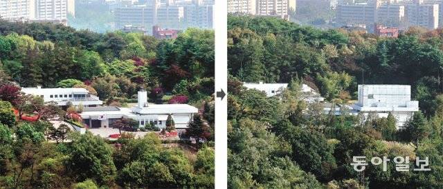 한남동 관저, 나무 더 심고 새 구조물 설치 윤석열 대통령 부부의 서울 용산구 한남동 관저 입주가 임박한 가운데 20일 오후 서울 중구 남산 포토 아일랜드에서 보이는 대통령 관저의 모습(오른쪽 사진). 올 4월 외교부 장관 공관으로 사용되던 때(왼쪽 사진)와 비교해 조경수로 관저 주위를 에워싸 내부 노출을 피했고, 옥상에 새로운 구조물을 설치해 정원이 내려다보이는 것을 막았다. 동아일보DB·송은석 기자 silverstone@donga.com