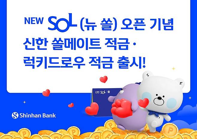 신한은행은 새 애플리케이션 '뉴 쏠'(New SOL) 출시를 기념해 지인과 함께하면 최고 연 7% 금리를 받을 수 있는 '신한 쏠메이트 적금'과 '십이(12)득(得)이벤트'로 최고 연 12% 금리를 받을 수 있는 '신한 럭키드로우 적금'을 21일 출시했다.