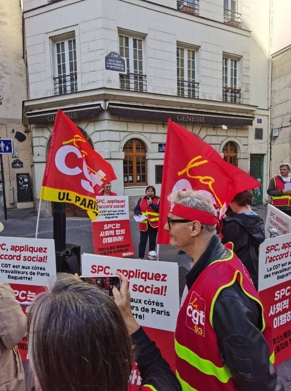 CGT 노조원 15명이 참여한 이날 집회는 오전 11시 30분부터 1시간 동안 파리바게뜨 샤틀레점 앞에서 열렸다. 이들은 파리바게뜨가 속한 SPC 그룹이 노동자들의 노조할 권리를 박탈하고, 안전을 위협하는 노동환경을 방치하며, 인권유린과 여성차별은 물론 상식적인 국제 노동법을 준수하지 않는 기업임을 전했다.