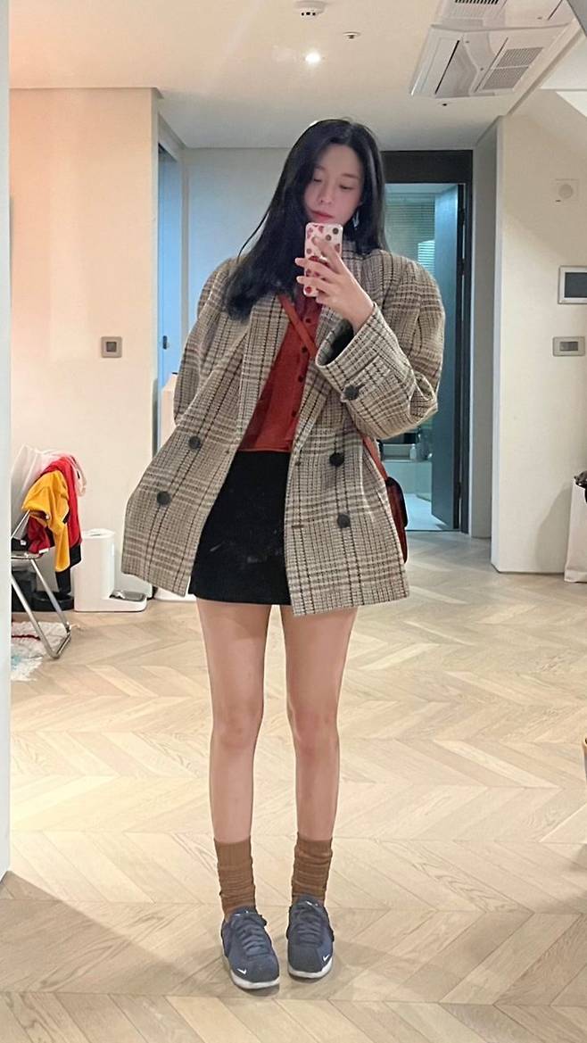 사진 속 설현은 체크 재킷과 니트 가디건, 미니스커트를 입고 거울 앞에서 셀카를 촬영하고 있다.