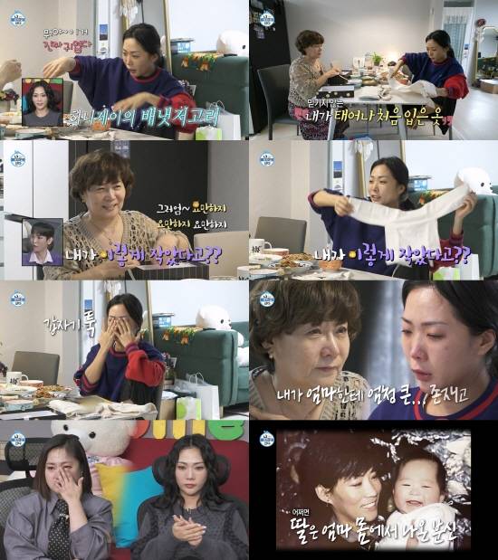 허니제이는 “내가 이렇게 작았다고?”라며 자신이 입었던 배냇저고리를 쓰다듬고 유심히 옷을 들려다 봤다. 이어 “이렇게 작은 아기를 어떻게 키웠대?”라며 어머니를 향한 고마운 마음을 슬쩍 표현하곤 툭 눈물을 떨궜다.