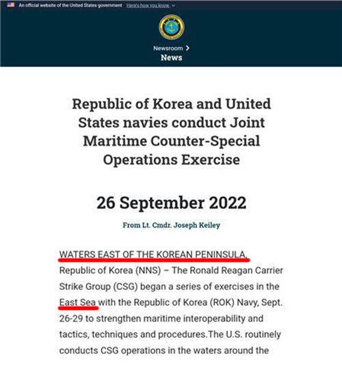 태평양 함대는 홈페이지에 게재한 지난달 26일자 뉴스에서는 처음에 "로널드 레이건호 항모강습단이 동해에서 한국 해군과 일련의 훈련을 시작했다"며 훈련장소를 '동해'라고 명기했지만, 현재는 해당 뉴스 페이지에서 '동해'라는 표현이 빠져 있습니다.