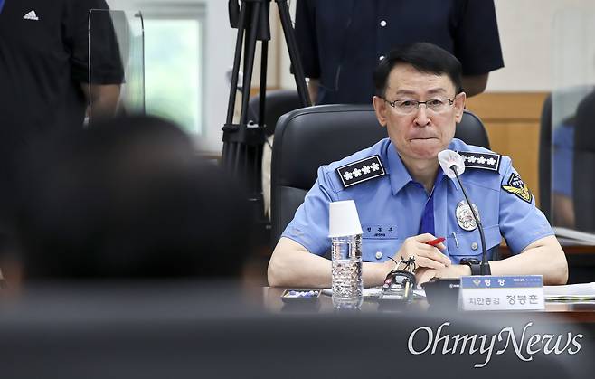 | ▲ 정봉훈 해경청장이 지난 6월 22일 인천 연수구 해양경찰청을 방문한 국민의힘 해수부 공무원 피격사건 진상조사TF팀과 회의에서 굳은 표정을 짓고 있다. |
