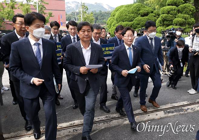 | ▲ 더불어민주당 윤석열정권정치탄압대책위원회 소속 국회의원들이 지난 9월 26일 오전 전정부 대한 표적감사 중단과 감사원장 면담을 촉구하며 서울 종로구 삼청동 감사원으로 들어가고 있다. |
