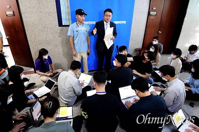 | ▲ 2020년 서해상에서 북한군에 사살된 해양수산부 공무원 이대준 씨의 형 이래진 씨(왼쪽)와 유족의 법률대리인 김기윤 변호사가 지난 6월 27일 오전 더불어민주당 우상호 비대위원장을 만나기 전 국회 민주당 대표실 앞에서 취재진에게 '대통령기록물 공개' 요청안을 설명하고 있다. |