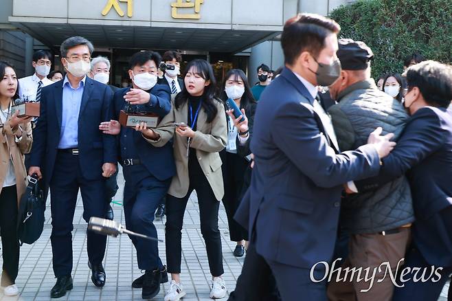 | ▲ 서욱 전 국방부장관이 21일 오후 서울중앙지법에서 ‘서해 공무원 피격 사건’ 관련 직권남용, 허위 공문서 작성, 공용전자기록 손상 등 혐의로 영장실질심사를 받았다. 영장실질심사를 마친 서욱 전 장관이 법원 건물을 나오는 순간 피격 공무원 고 이대준씨의 친형 이래진씨가 서욱 전 장관을 향해 욕설을 하며 달려들자 법원 직원들이 제지했다. |