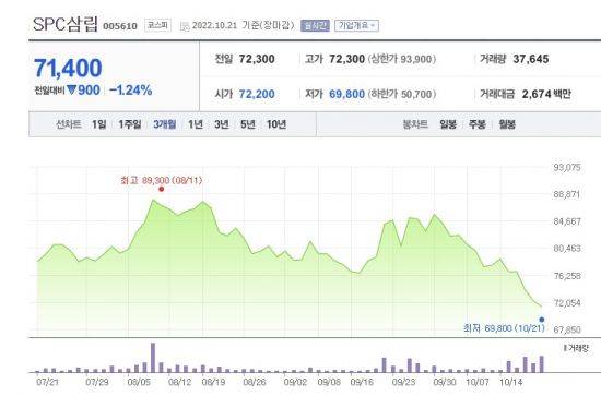 22일 한국거래소에 따르면 전날 SPC삼립 주가는 7만2200원에 출발해 장중 6만9800원까지 밀리며 7만원 밑으로 하락했다. SPC삼립 주가가 7만원 밑으로 내린 건 지난 6월24일(종가 6만9900원) 이후 4개월여 만에 처음이다. 전 거래일 대비 1.24% 떨어진 7만1400원에 거래를 마쳤다. 사고 직전 거래일인 14일(7만7600)과 비교하면 8%가량 떨어진 지점이다. 사고가 발생한 직후 거래일인 17일 이후 5거래일 연속 하락세를 면치 못했다.