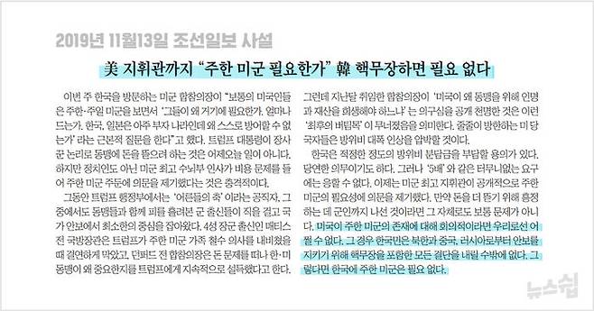 한미 동맹의 중요성을 믿는 보수 세력에게, 트럼프 행정부의 이러한 언사는 모욕적이었다. 조선일보는 11월 13일 사설을 통해 "핵 무장을 하면 주한미군은 필요없다"며 독자적 핵 무장을 주장한다.