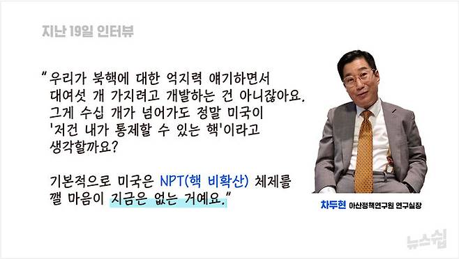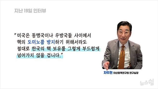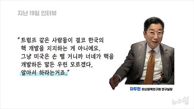 미국의 용인 없이 미국이 만든 질서를 깨는 한국의 자체 핵 개발에 대해, 미국은 동맹을 깨자는 것으로 받아들일 것이라고 차두현 실장은 전망했다.