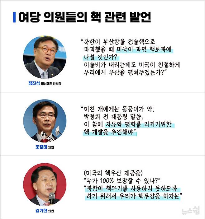올해 하반기 들어 김정은의 전술핵 관련 도발이 이어지자, 최근 보수 여당에서 핵은 핵으로밖에 막을 수 없다는 목소리가 다시 커지고 있다.