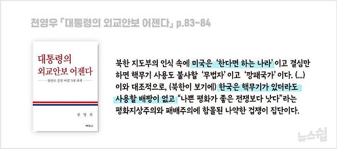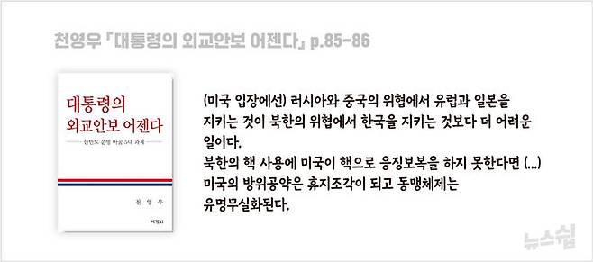천영우의 저서에도 뉘앙스는 좀 다르지만 비슷한 취지의 대목이 나온다. 그는 '미국이 한국을 지키기 위해 뉴욕이나 LA가 북한의 핵미사일 공격을 받을 위험을 감수할 수 없을 것'이라는 주장은 두 가지 잘못된 전제에 근거하고 있다고 지적한다. 첫 번째 잘못된 전제는, 미국의 동맹국이 한국밖에 없다는 전제다. 미국에겐 한국보다는 나토(NATO) 회원국들과 일본이 더 중요한 동맹국이라면서 그는 다음과 같이 썼다. 한국을 핵우산으로 보호하지 못하면 미국의 안전 보장 약속에 대한 전 세계의 신뢰가 무너진다는 것이다.