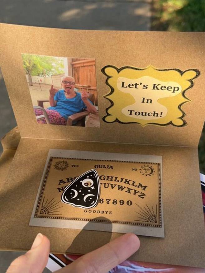 조디가 남긴 카드에는 장난끼 가득한 표정을 짓고 있는 조디의 사진과 "계속 연락하자!"는 메모, 그리고 작은 '위저 보드'가 들어 있었습니다.