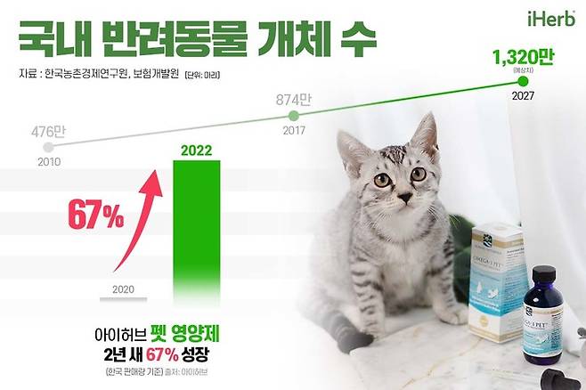 영양제 해외직구 전문 플랫폼 아이허브에 따르면 2019년 이후 2년간 한국시장 반려동물 영양제 매출액은 67% 이상 급등했으며 특히 오메가3를 비롯해 관절 및 뼈 건강, 구강, 장, 눈, 피부 건강 등 다양한 종류의 반려동물 영양제가 인기를 끌고 있다.