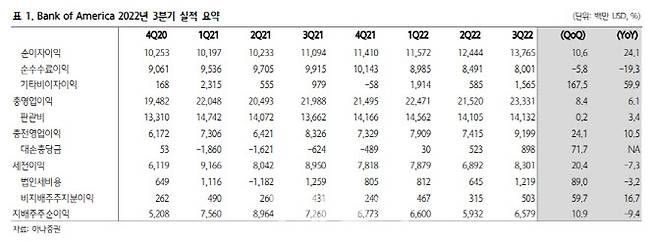 시장에서는 BoA의 비용관리 역량이 돋보였다고 평가했다. 최정욱 하나증권 연구원은 “3분기 비이자비용은 약 153억달러로 전분기 대비 0.2% 증가하는데 그쳤는데 이번 분기에 포함된 소송비용 3억5000만달러를 제외하면 2.3%나 감소한 것”이라며 “비용관리 역량이 확연히 드러났다”고 설명했다. 게다가 경영진은 실적발표 컨퍼런스콜에서 인플레이션에도 불구하고 비용을 현 수준에서 크게 벗어나지 않도록 조절해 나가겠다는 의지를 표명하기도 했다.