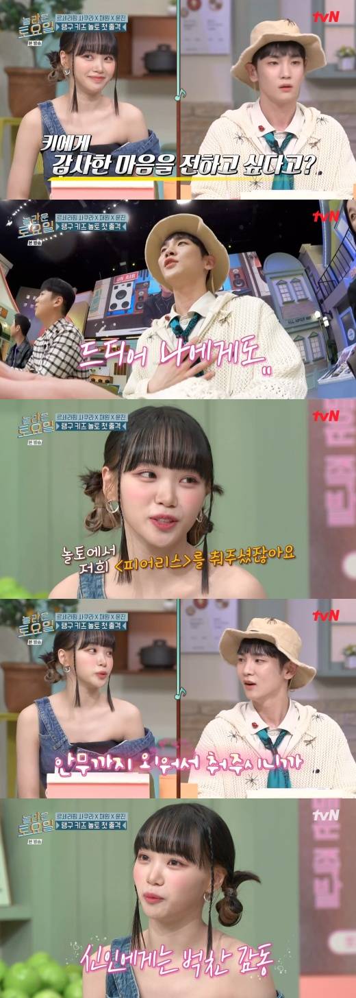 김채원은 “저번에 ‘놀토’에서 저희 ‘피어리스(FEARLESS)’를 춰주셨다”라며, “그거 노래를 아는 것도 신기한데 안무까지 외워서 춰주시니까 진짜 너무 감동이었다”라고 키에게 감사의 뜻을 표했다.