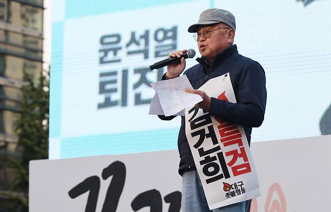 | ▲ 윤석열 대통령의 부인 김건희 여사에 대해 쥴리 의혹을 제기한 안해욱 전 대한초등학교태권도협회장이 22일 오후 서울 중구 서울시청 인근에서 열린 11차 김건희 특검, 윤석열 퇴진 전국집중 촛불대행진에 참석해 발언하고 있다. |