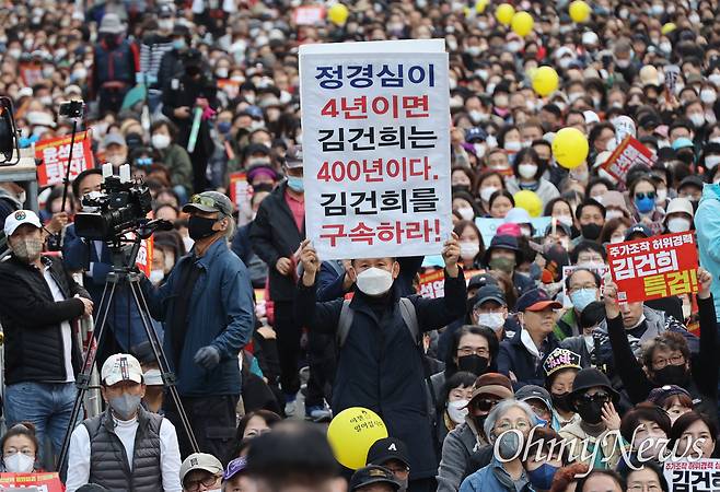 대로를 가득 메운 시민들은 '주가조작 허위경력 김건희 특검!' '민생파탄 정치보복 평화파괴 친일매국 윤석열 퇴진!' 등이 적힌 피켓을 들고 "윤석열은 퇴진하라"고 수 차례 외쳤다.