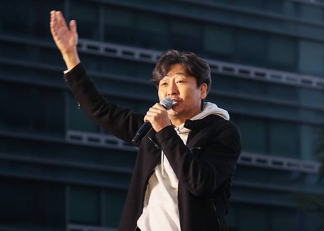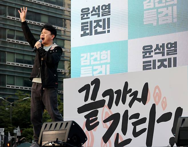 | ▲ 개그맨 강성범이 22일 오후 서울 중구 서울시청 인근에서 열린 11차 김건희 특검, 윤석열 퇴진 전국집중 촛불대행진에 참석해 발언하고 있다. |