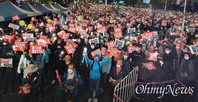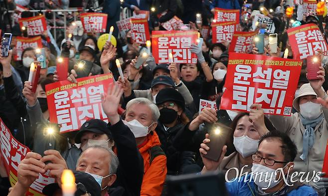| ▲ 전국에서 모인 수많은 시민들이 22일 오후 서울 중구 서울시청 인근에서 열린 11차 전국집중 촛불대행진에 참석해 윤석열 대통령 퇴진과 김건희 여사 특검 수사 등을 촉구하며 구호를 외치고 있다. |