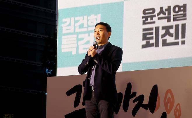 | ▲ 김용민 더불어민주당 의원이 22일 오후 서울 중구 서울시청 인근에서 열린 11차 김건희 특검, 윤석열 퇴진 전국집중 촛불대행진에 참석해 발언하고 있다. |